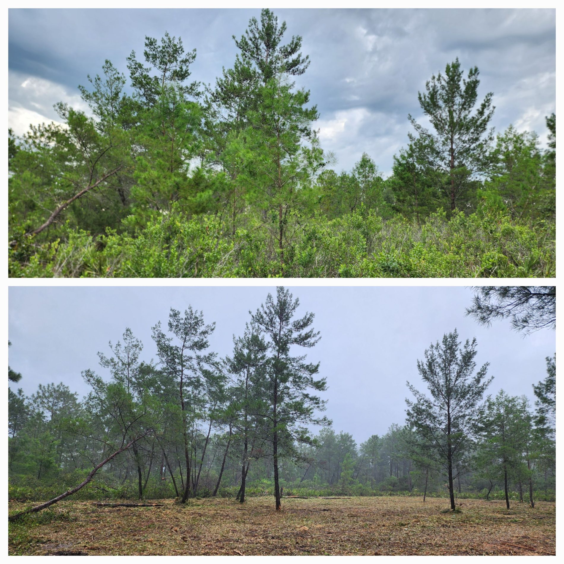 Available services include Forestry Mulching, Root Raking, Bushhog, Lot Clearing, Grading, Fence Lines, Right of Way maintenance, and more.